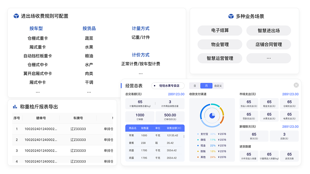 金馬衡器智慧農(nóng)批系統(tǒng)是集成市場物業(yè)管理、電子結(jié)算、進出場管理等系統(tǒng)為一體的綜合解決方案,結(jié)合金馬衡器自研的電子臺秤、汽車衡器等智能物聯(lián)網(wǎng)設(shè)備,打造農(nóng)產(chǎn)品批發(fā)市場運營服務(wù)新模式,助力現(xiàn)代農(nóng)批市場數(shù)字化轉(zhuǎn)型升級,實現(xiàn)業(yè)務(wù)的可持續(xù)化增長